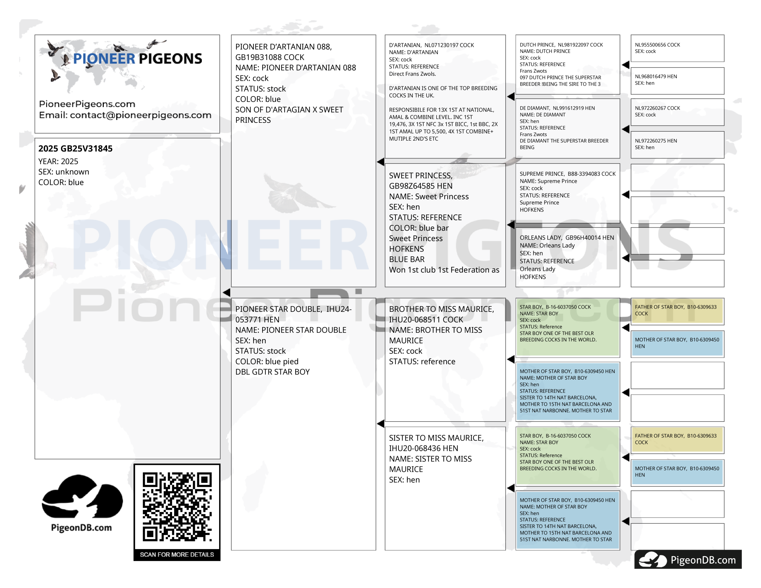 GB25V31844 is bred from the outstanding pairing of Pioneer D’Artanian 088 and Pioneer Star Double. This combination brings together two of the most powerful bloodlines in modern European racing pigeon breeding — the Frans Zwols D’Artanian dynasty and the Maurice O’Donnell Star Boy One Loft line. This bird’s lineage is steeped in performance excellence — merging the world-famous D’Artanian × Sweet Princess × Dutch Prince × De Diamant foundation from Frans Zwols with the global One Loft Race success of Star Boy, sire of winners in South Africa and Thailand.